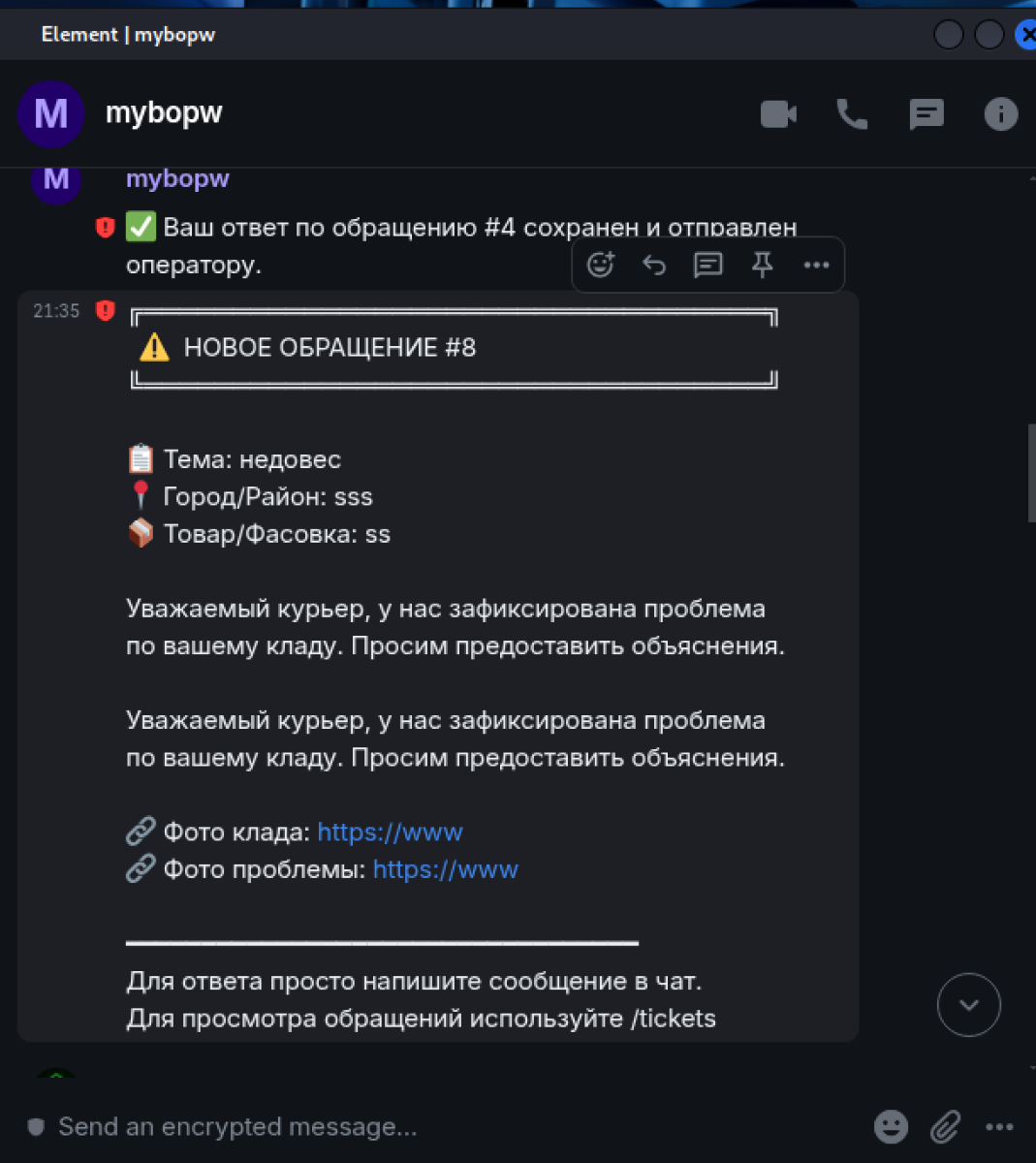 Курьер получает уведомление прямо в Element (безопасный мессенджер). Один клик — и вся информация перед ним: