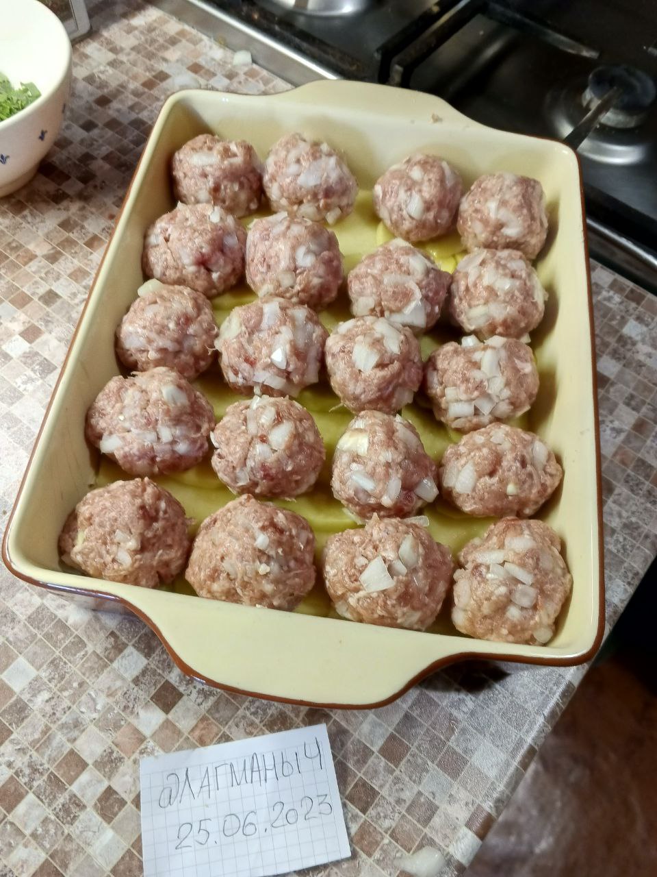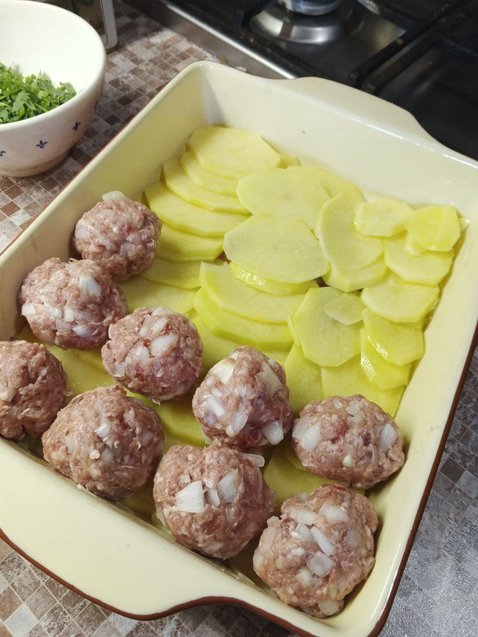 Присаливаем картошку и сверху выкладываем сформированные фрикадельки