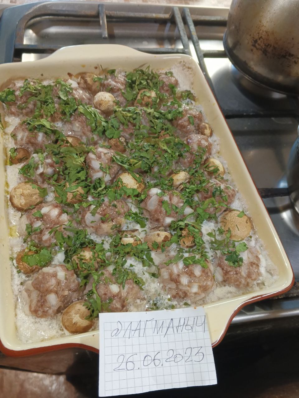 Теперь заливаем сливки , стараясь каждую фрикадельку полить сливками , посыпаем сверху рубленой зеленью, и ставим в разогретую до 180 градусов духовку на 45 минут