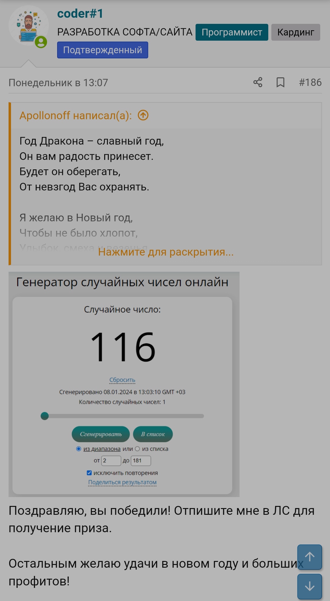 После того, как победитель отписал о получении выигрыша, а на мой взгляд это было довольно сухо и не развëрнуто, учитывая, что человек получил 30к за счёт обычного рандома - 1 счастливчик из +-125 других пользователей судя по лайкам, то у меня появились некоторые вопросы.
