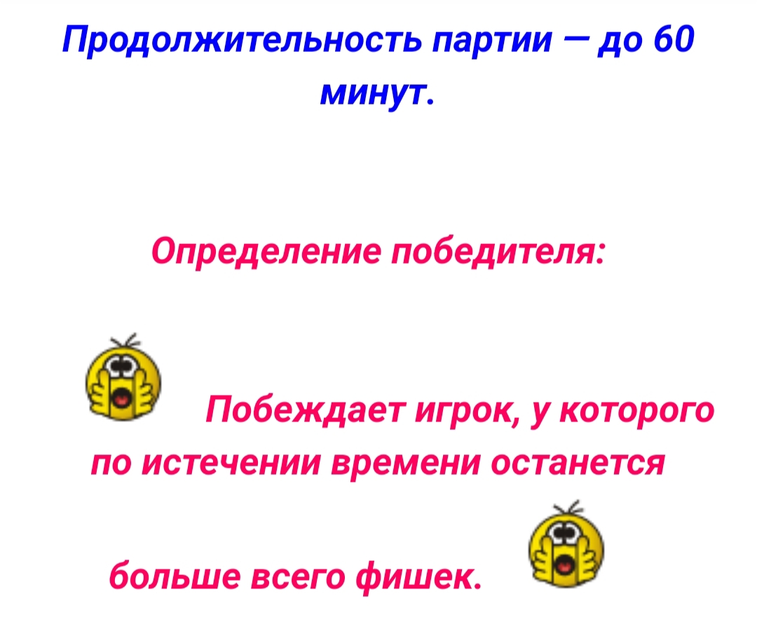 Побеждает игрок, у которого по истечении времени останется больше всего фишек.
