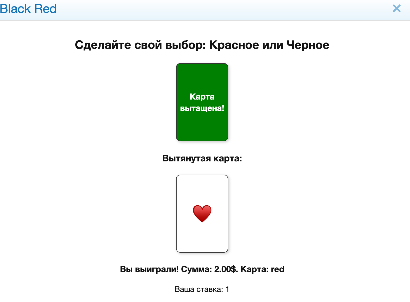 7. Пользователю необходимо сделать ставку — сумму в $ (не больше допустимого баланса), указать целое число и выбрать цвет: красный или чёрный.