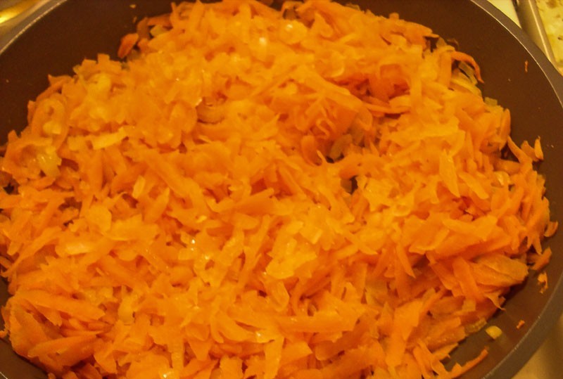 На другой сковороде растапливаем 10 г сливочного масла и выкладываем натёртую морковь. Тушим минут 5 до размягчения моркови, помешивая