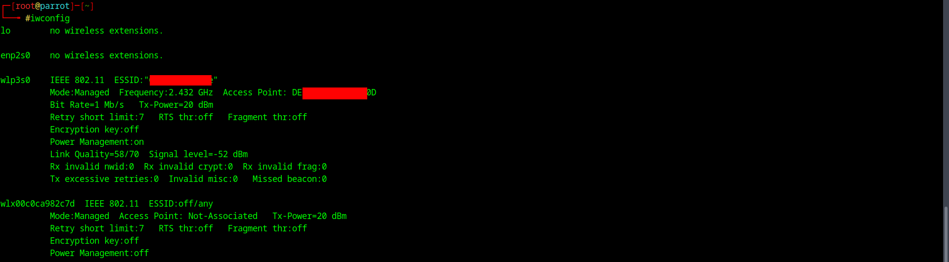 1. iwconfig - Определение названия WiFi-адаптера (в моём случае это - wlx00c0ca982c7d. Чтобы на 100% быть уверенным, вытащите usb кабель WiFi-адаптера из разъёма и повторите ту же команду, если какой-либо из адаптеров исчез из списка, значит это именно он. Затем снова подключите WiFi-адаптер и продолжайте следовать инструкциям).