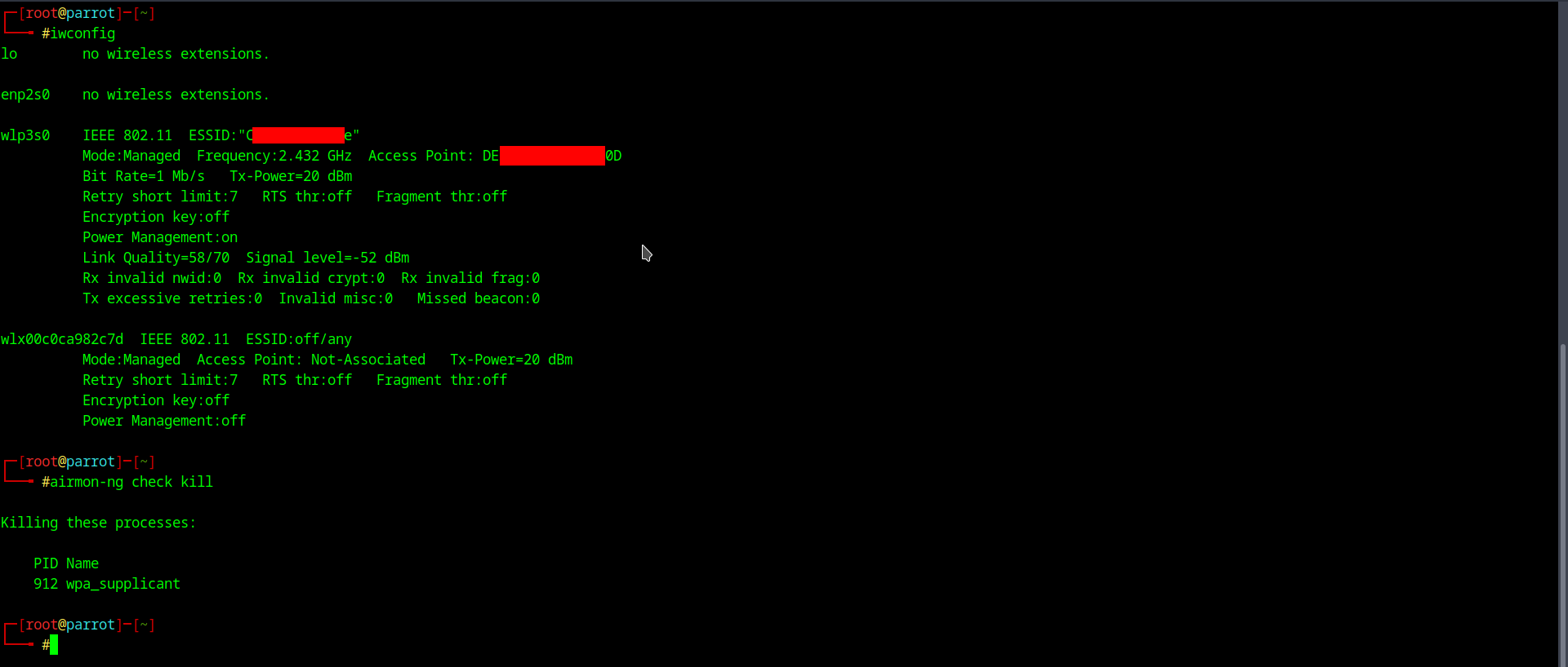 3. airmon-ng start wlx00c0ca982c7d - Включить режим монитора (при повторном введении команды "iwconfig", в выводе появится "wlan0mon", это означает, что WiFi-адаптер теперь будет работать в режиме мониторинга пакетов)