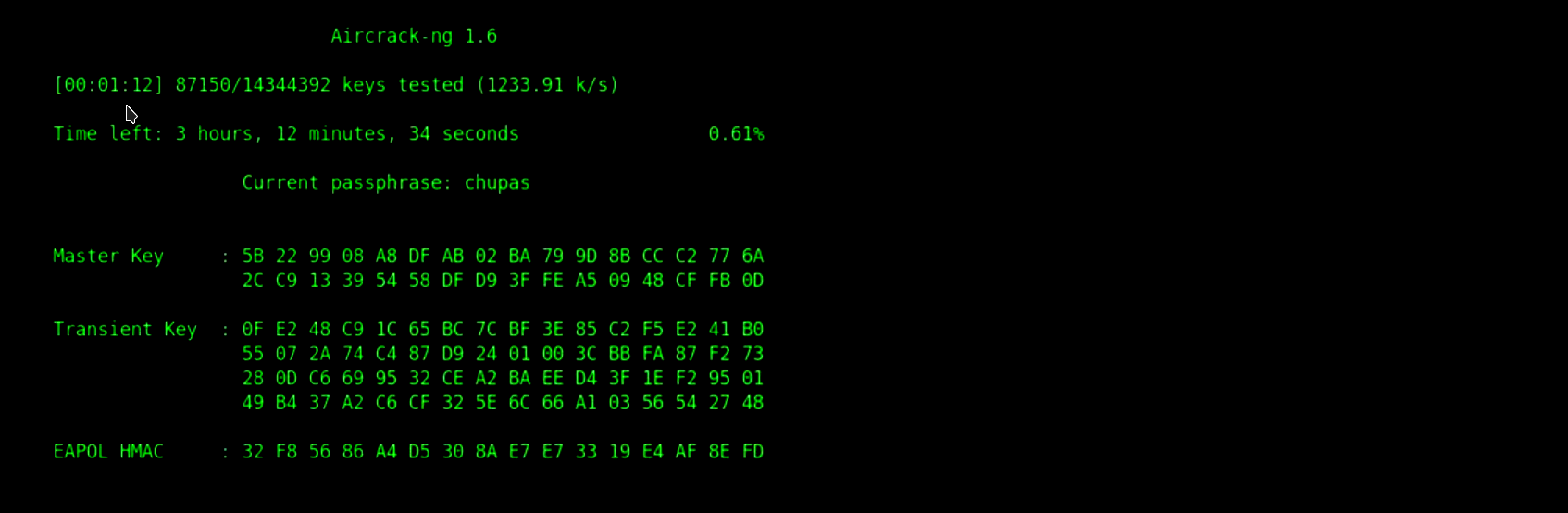 11. И, о чудо, результате всех этих действий: "KEY FOUND! [ 001122334455 ]"