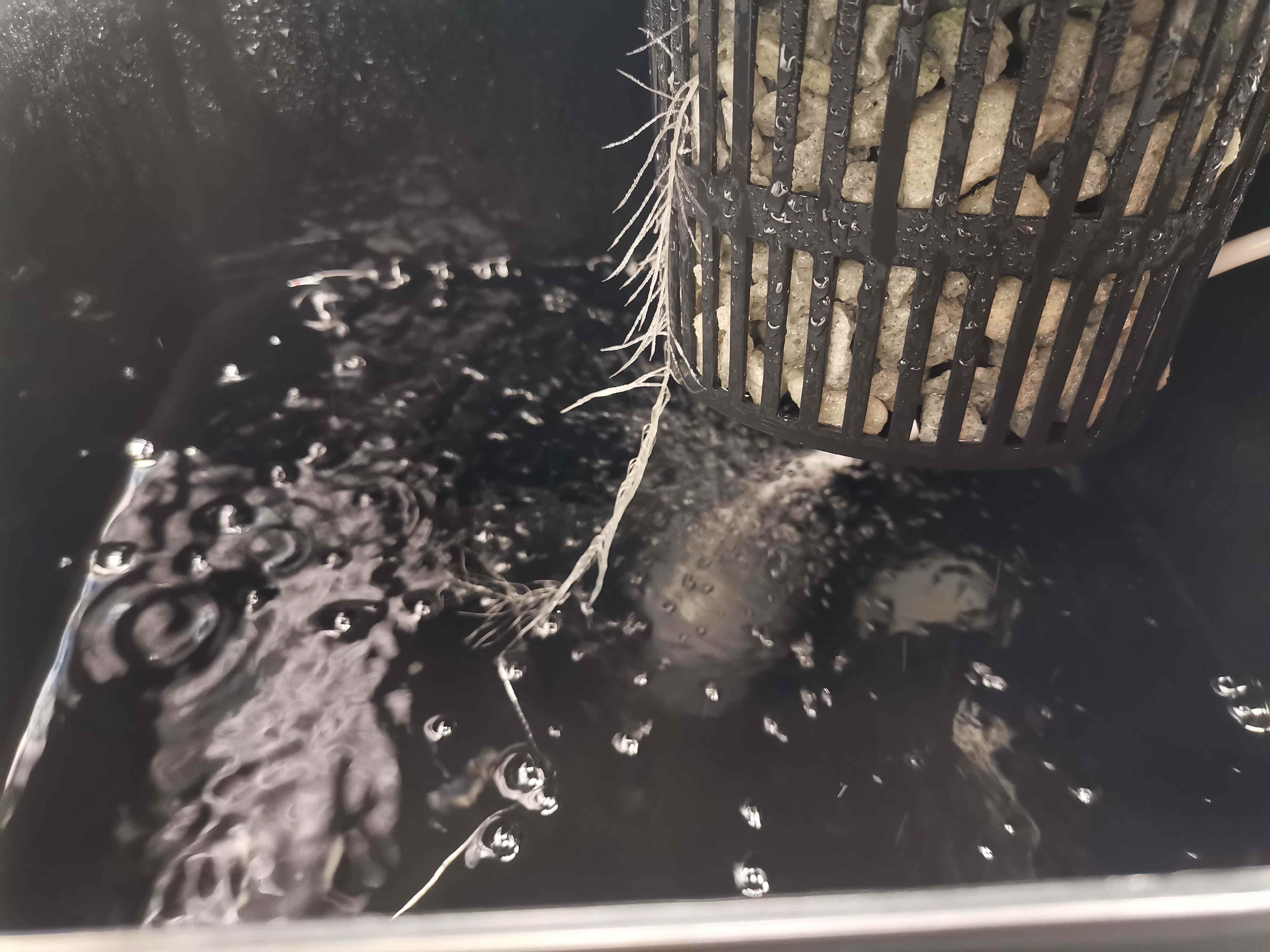 - Установи сетчатый горшок с субстратом в крышку резервуара, чтобы нижняя часть слегка касалась/получала капельки раствора (или капельный полив). 3-4см от поверхности воды хватит. Субстрат должен увлажниться, чтобы растение искало корнями воду. Слишком сильное увлажнение ни к чему.