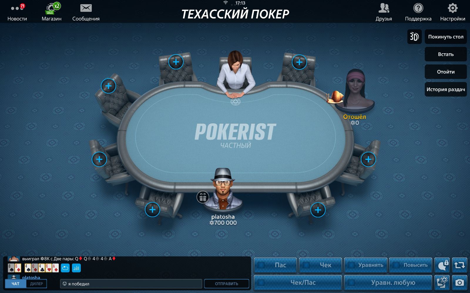 Если в течение 60 минут за столом останется только один игрок с фишками, он автоматически становится победителем.