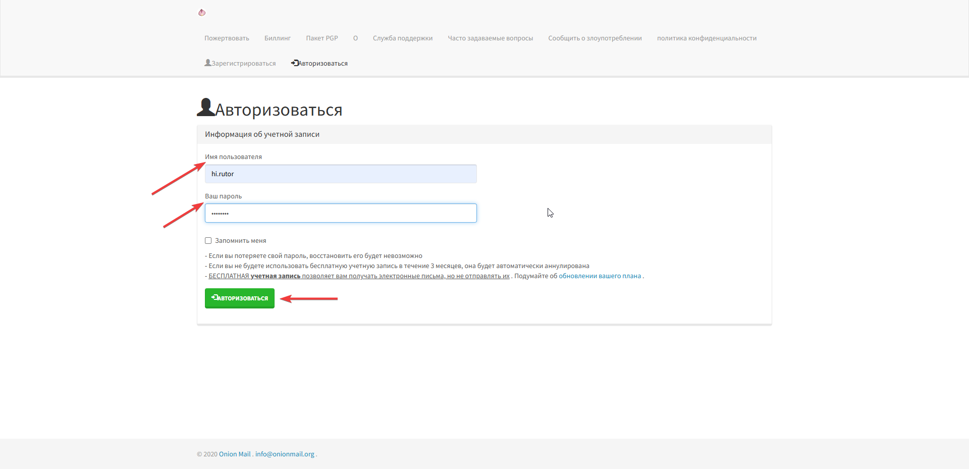 Просто указываем полученную анонимную почту ранее, желаемое имя и пароль