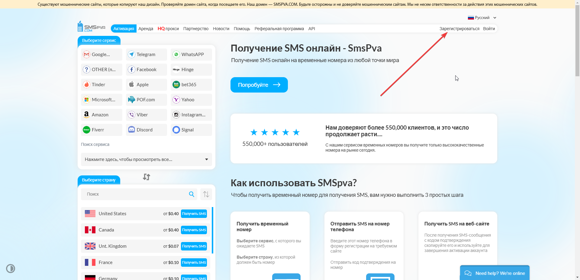 После того как мы зашли по ссылки указанной сверху, перед нами рисуется сам сайт сервиса, где мы должны зарегистрироваться и выбрать нужный нам тип услуги, а именно