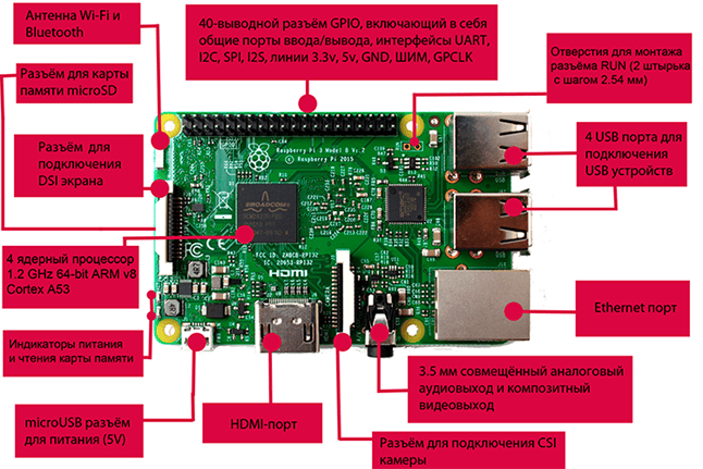 - Порты: 4 x USB 2.0, HDMI, аудиовыход, GPIO (40 пинов), карта памяти microSD, CSI, DSI
