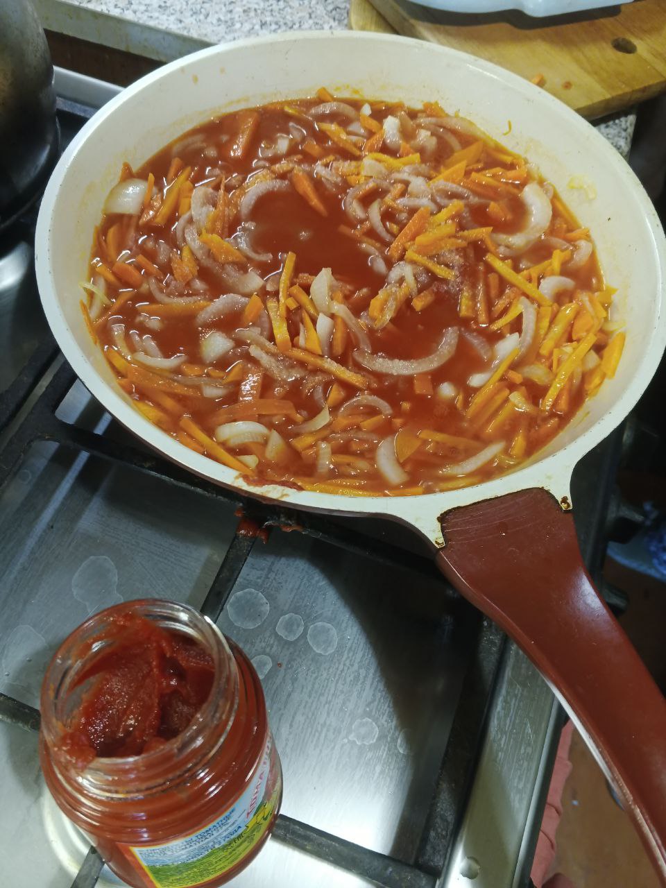 Добавляем томатную пасту, кипячёную воду