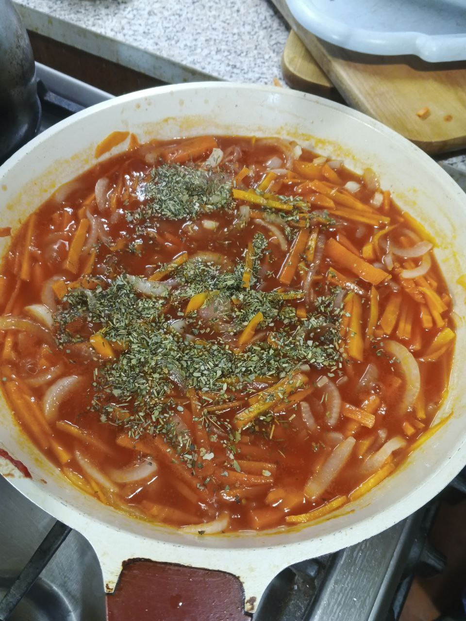 Затем закидываем специи и даём немного потушиться
