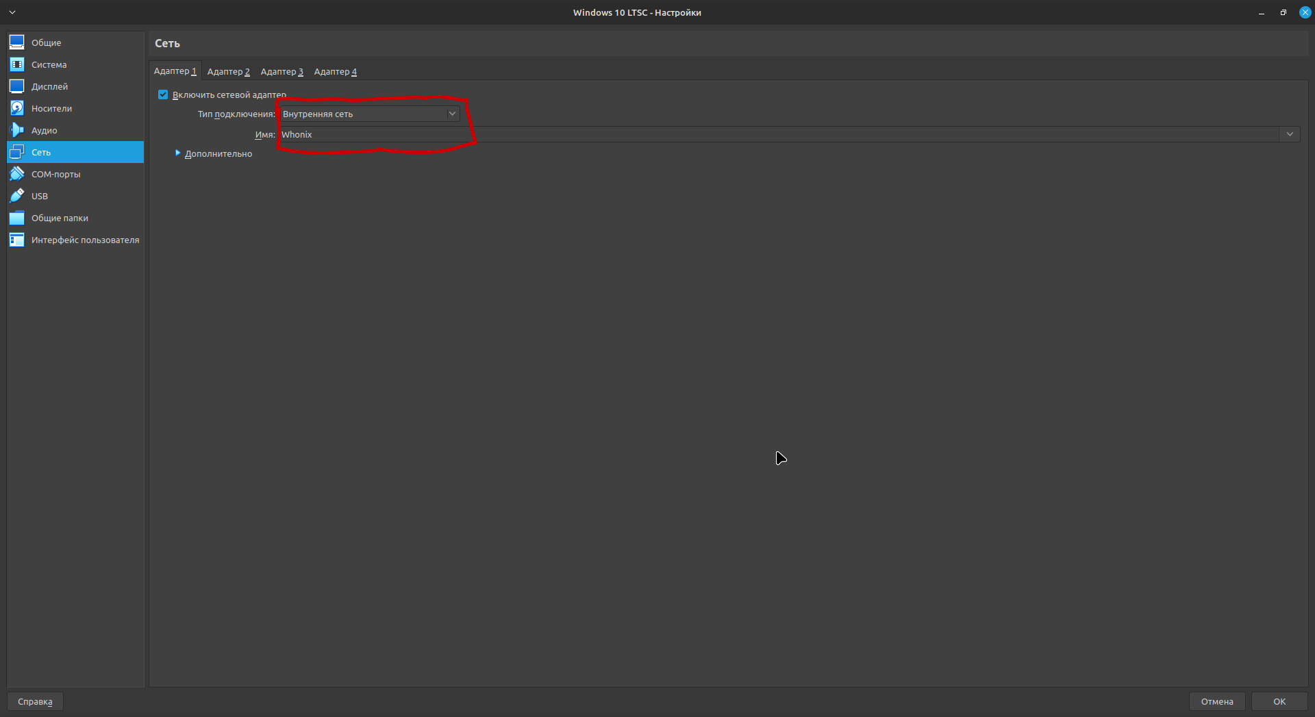 Первое, что необходимо сделать - подлючить Windows 10 к внутренней виртуальной сети Whonix, делается это в настройках виртуальной машины в пункте "Сеть"