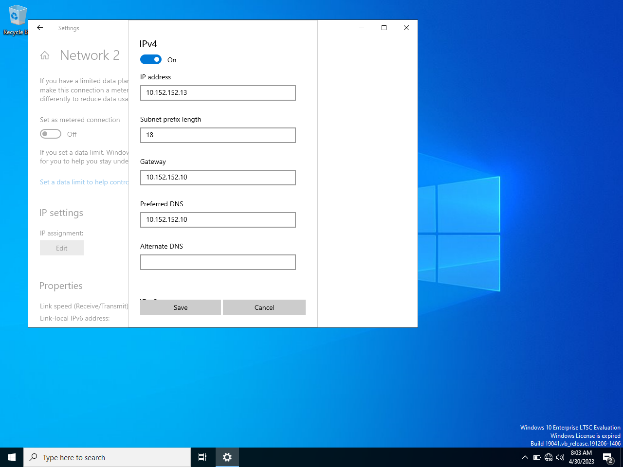 Далее включаем IPv4 и вбиваем значения, как показано на скриншоте и нажимаем "Save"