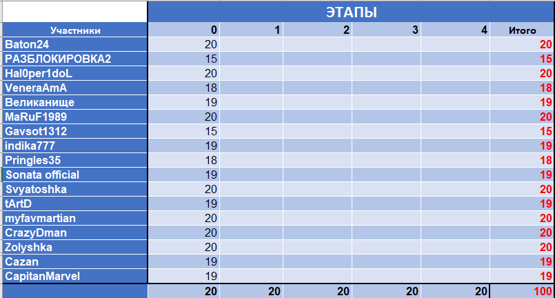 За каждый из них вы можете получить максимум 20 баллов. Выигрывает тот, кто получает максимальное количество баллов. Каждую неделю будет публиковаться сводная таблица участников и баллов.